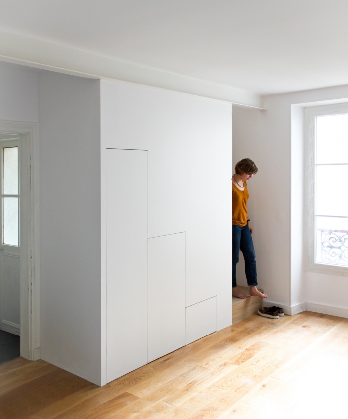 L’escalier est enveloppé dans une boîte blanche qui devient à la fois escalier et placard. En contraste, les marches sont conçues en bois et rappellent la tonalité des parquets existants (idée de continuité du sol). La neutralité de ce dispositif nous permet d’envisager l’aménagement de placards tout le long de la pièce. Ce système de placard permet de garantir une intimité de la chambre (tampon phonique).
