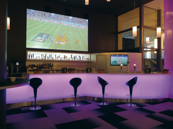 La création du « Bar des Loges » a requis une intention particulière à la scénographique. Cet espace doit s’adapter, par la projection d’images et la lumière, aux différents évènements organisés par le stade de France que ce soit une manifestation ponctuelle ou l’utilisation du lieu par les différents partenaires du Stade (Coca cola, Kraft Food France...).