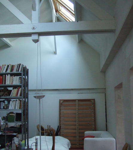 Etant donné la belle hauteur sous plafond et de l'arrivée de la lumière du jour par 2 Velux existants, on a organisé l'espace sur 2 niveaux, en créant une mezzanine sur toute la longueur (mais seulement sur la moitié de la largeur, afin de conserver la luminosité), où l'on a placé les 2 chambres. On a utilisé la sous pente de escalier centrale qui dessert les chambres, pour mettre les toilettes, afin d'optimiser au maximum l'espace. Sous les chambres, une salle de bain tout en longueur a été créée, ainsi que des dressings et divers rangements. Enfin, dans la partie avant, on a placé la bibliothèque avec un petit "salon de lecture".