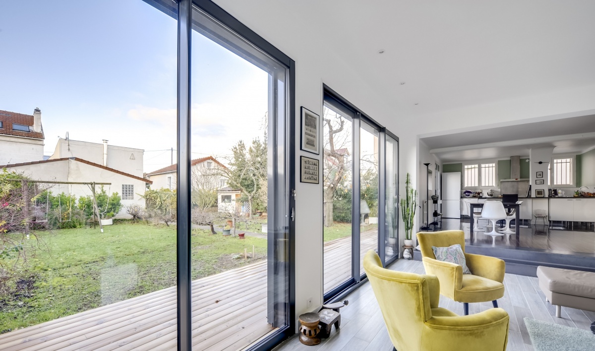 Retournement de la maison vers le jardin, extension pour un grand salon, gestion progressive des niveaux pour se rapprocher du niveau du jardin, grandes ouvertures créées;