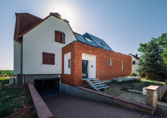 L’architecture de l’extension se compose de deux entités qui s’emboitent avec précision à l’existant. Le dialogue entre ses différents volumes s’exprime autant dans la composition extérieur que la spatialité intérieure. La façade Sud du bâtiment existant, vient déteindre sur le volume crée, marquant de son empreinte une géométrique d’archétype de maison a pignon. Cela donne l’impression d’appropriation de l’extension par l’existant.