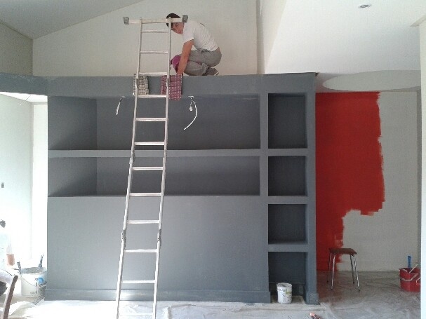 Les nouveaux propriétaires voulaient réaliser deux chambres avec une salle d'eau commune aux chambres ainsi qu'une grande salle à manger. Ils souhaitaient aussi masquer l'escalier existant qui mène au garage. Le volume existant étant haut sous toiture, l'idée de créer une mezzanine pour un bureau a été retenue. L'ouverture existante reliant la maison au grand volume a été agrandie afin de mieux lier ces deux espaces.