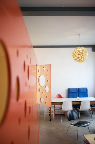 Afin d'amener de la lumière dans ces deux pièces et d'adoucir la géométrie, leurs ouvertures se font par un jeu de ronds de tailles variables et aléatoires.