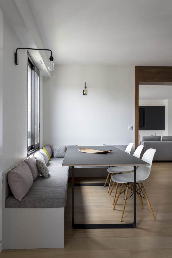 Restructuration complète d'un appartement dans un immeuble récent. Ouverture dans un mur porteur pour ouvrir la cuisine/salle à manger sur le salon. Création d'une verrière pour éclairer l'escalier intérieur. Grande cuisine noire avec une niche et îlot central. Grande banquette coin repas. Création d'une cloison arrondie dans un couloir pour réduire l’effet couloir. Coin bureau dans une circulation. Chambre d'enfant ludique.