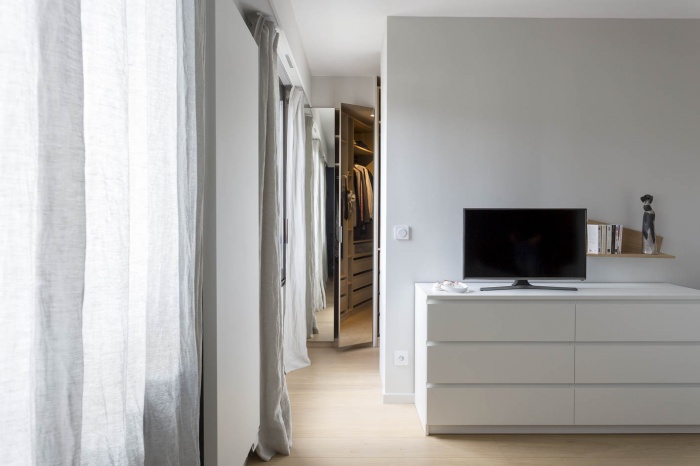 Salon, grand meuble bas banquette filant sur mesure. TV dans une niche sombre.